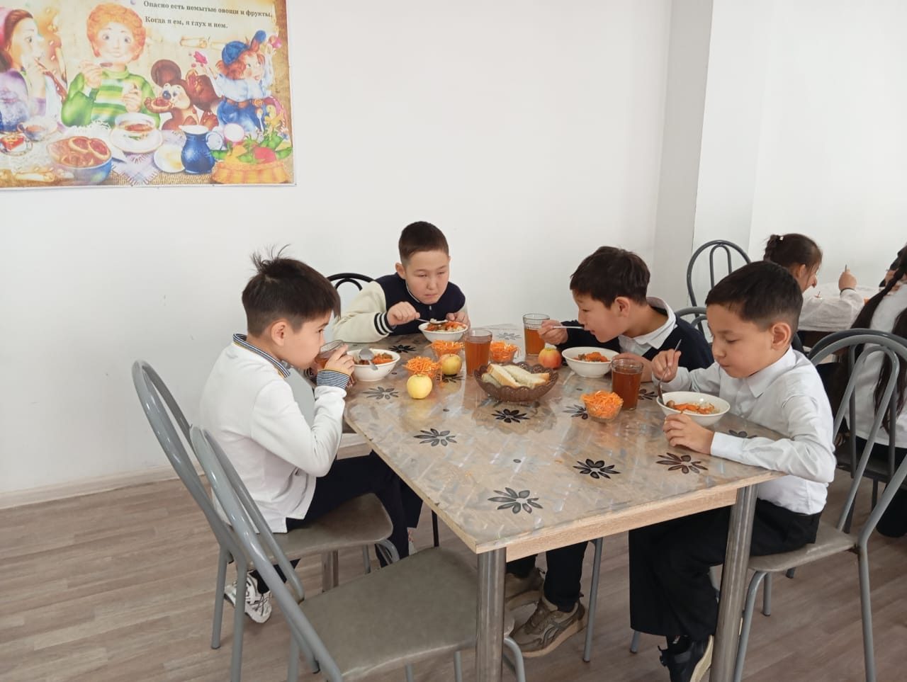 Қабырғада перспективалық және күнделікті мәзір ілінген. Осы мәзірге сәйкес келесі тағамдар дайындалды.