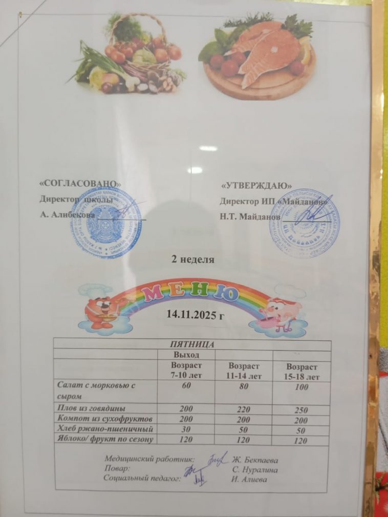 Біз, төменде қол қоюшылар, осы актіні 2025 жылғы 14 қараша күні мектеп асханасында тағамдардың сапасы, ас блогының жұмысы және қызмет көрсету барысы тексерілгенін растай отырып, толтырдық.